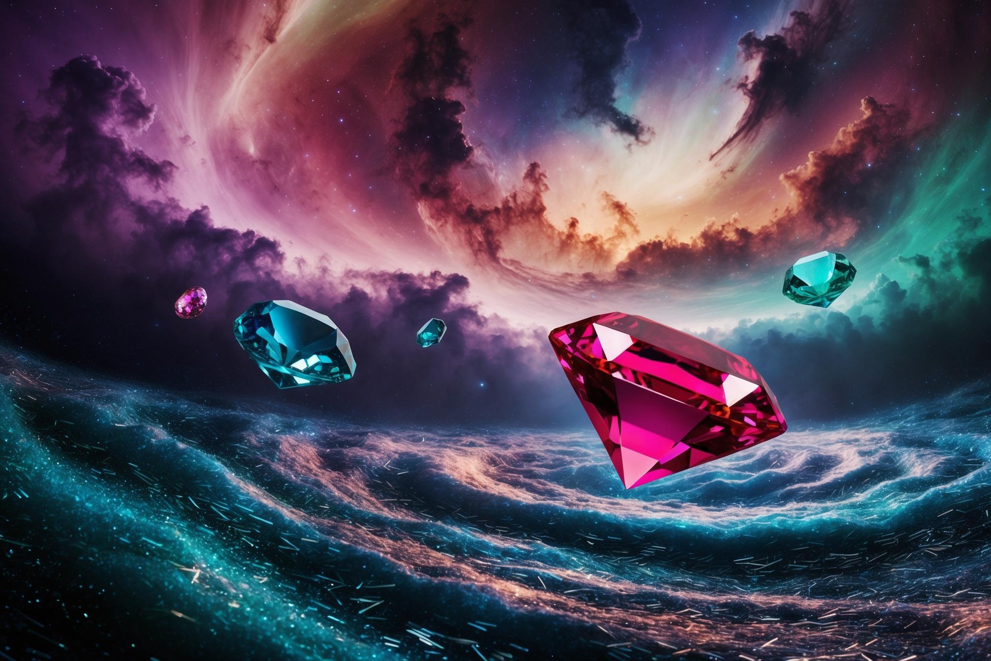 This is an image featuring a fantastical scene with a backdrop of vibrant, swirling clouds and stars that resemble planets. The foreground showcases several large gemstones, possibly rubies or similar precious stones, floating in the air above what appears to be water or another liquid medium below. There is also a gemstone falling towards the water from one of the clouds. The overall atmosphere of the image suggests a blend of fantasy and reality, with an emphasis on color and light that gives it a dreamlike quality.